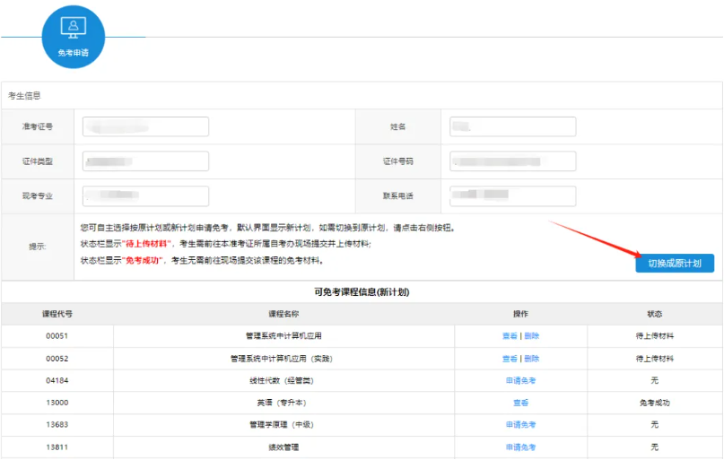 (四)2024年7月前已注册成功的考生可选择按原计划或新计划进行免考申请(默认显示新计划,可点击按钮进行计划版本的切换)
