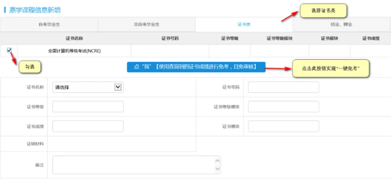 2.选择证书类→勾选出现的信息→勾选后点击蓝色按钮(见图3)→直接得到免考审核结果。