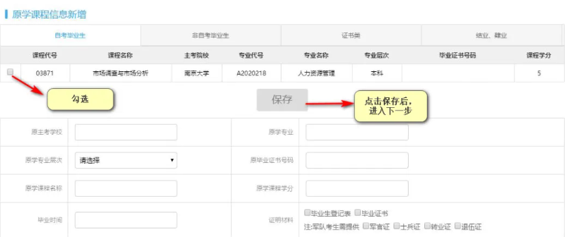 (六)使用本人江苏自考已毕业课程成绩用于申请免考的,可点击“自考毕业生”,如出现可勾选课程用于免考申请的(见图4),须勾选后再点击保存。